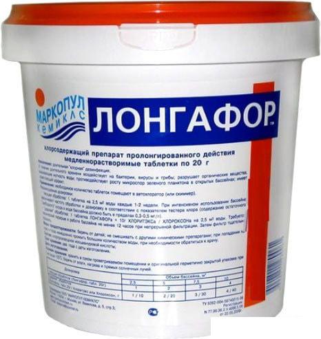 Описание Краткая информация об отличиях товара от конкурентных моделей и аналогов, сведения о позиционировании на рынке, преемственности и др. Назначение: длительная "хлорная" дезинфекция. Возможна отгрузка химии для бассейнов оптом партиями уже от 1 гофроящика. Химия для бассейнов "Лонгафор" в течение длительного времени воздействует на бактерии, вирусы и грибы, хлор разрушает органические вещества, вызывающие мутность воды бассейна; препарат противодействует росту микроспор зелёного планктона в открытых бассейнах, имеет осветляющий эффект, не содержит кальция. Применение: необходимое количество таблеток помещают в автохлоратор (или скиммер). |