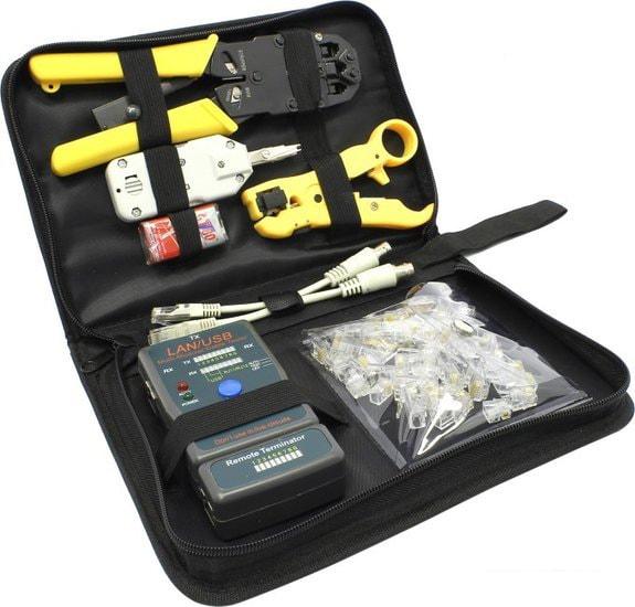 Обжимные клещи LY-T2008R (с фиксатором), нож LY-352 для зачистки и резки кабеля, нож KRONE LY-T2020B, кабельный тестер LY-CT011 с батарейкой 9V, по 20 коннекторов RJ11 и RJ45 | комплект №1| комплект №2| сумка |