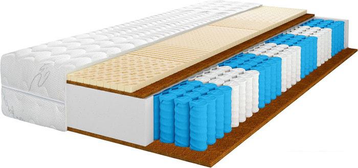 Кокосовая койра Кокосовая койра изготавливается из волокон кокосового ореха, полученных тем или иным способом. Натуральный материал пропитываются латексом (искуственным или натуральным) и приобретают упругость, быстро восстанавливают первоначальную форму, не имеют остаточной деформации. Впрочем, считается, что кокосовые койры недолговечны и могут со временем деформироваться. Слой кокосовой койры придает матрасу дополнительную жёсткость. |