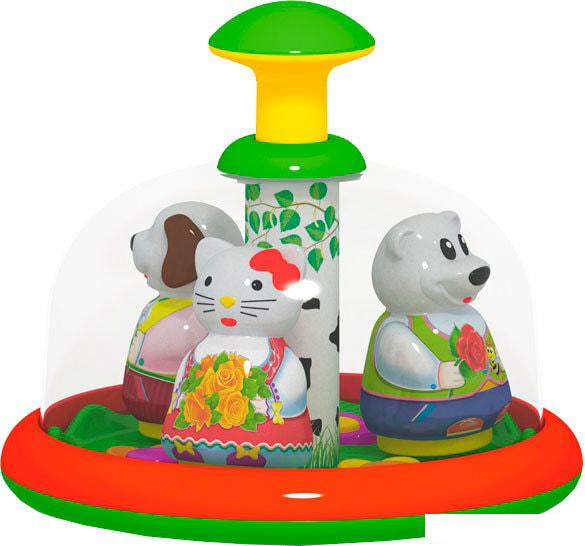 Юла-карусель «Хоровод» - это музыкальная игрушка для самых маленьких. Малыш сможет сам запускать юлу-карусель и следить за тем, как зверушки в нарядных костюмах кружатся вокруг своей оси под веселую народную мелодию. И даже после остановки купола неугомонные зверушки продолжают крутиться, словно в танце. Ребенку будет интересно разглядывать ярких зверушек, разноцветные цветочки и полянку с березкой.