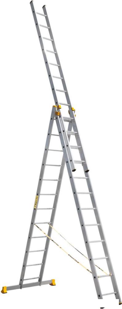 Профессиональная трёхсекционная универсальная лестница ALUMET P3 сделана из особо прочного алюминиевого профиля. Уверенный подъём и спуск дают усиленный корпус каждой секции, крюки-фиксаторы и стабилизатор-траверса шириной 120 см с опорными вставками. Безопасному использованию функции "стремянка" способствует наличие боковых планок. Алюминиевая трехсекционная лестница ALUMET P3 несмотря на свои мощные габариты, эргономичная и удобная, два специалиста могут легко смонтировать секции лестницы и установить конструкцию на необходимую высоту, в труднодоступных местах более удобна, чем вышки и леса. | |