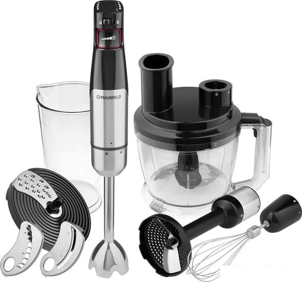 Блок мотора Насадка для измельчения Насадка для картофельного пюре Венчик Стакан блендера с мерной шкалой Чаша измельчителя Нож для мелкой шинковки Нож для средней шинковки Нож для крупной шинковки |