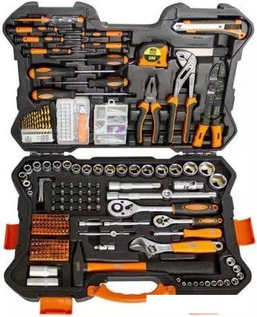 13шт. - 1/4"Головки: 4, 4.5, 5, 5.5, 6, 7, 8, 9, 10, 11, 12, 13, 14мм 18шт. - 1/2"Головки: 10, 11, 12, 13, 14, 15, 16, 17, 18, 19, 20, 21, 22, 23, 24, 27, 30, 32мм 1шт. - 1/4"Трещотка реверсивная 1шт. - 1/4"Т-образный вороток 2шт. - 1/4"Удлинители: 50, 100мм 1шт. - 1/4"Кардан шарнирный 1шт. - 1/4"Рукоятка 150мм 1шт. - Битодержатель 1/4"(F) x 1/4"(F) 25мм 1шт. - 1/2"Трещотка реверсивная 2шт. - 1/2"Удлинители: 125, 250мм 1шт. -1/2 Адаптер с отверстием 1шт. - 1/2"Кардан шарнирный 2шт. - 1/2"Свечные головки: 16, 21мм 1шт. -Битодержатель 1/2""(F)x5/16""(F) 24шт. -Биты 5/16"х 30мм: "SL: 5.5-6.5-7-8мм PH: 3-4 PZ: 3-4 H: 5.5-6.5-7-8мм M: 5-6-8-10 T:25-27-30-35-40x2-45-50" 1шт. - Ключ разводной 8" 1шт. - Молоток 300гр. 1шт. - Клещи для снятия изоляции и обжимки клемм 9" 1шт. - Комбинированные пассатижи 7" 1шт. - Переставные пассатижи 10" 1шт. - Нож универсальный 10шт. - Лезвия для ножа в чехле 1шт. - Рулетка 3м х 16мм "4шт. - Отвертки: SL: 4x100, 6.5x125мм PH: 1 x 80, 2 x 100мм" "5шт. - Отвертки для точных работ: SL: 2.5-3.0мм PH: 0-00-000" 1шт. - Отвертка индикаторная 7шт. - Набор ключей Г-образных HEX: 1.27, 1.5, 2, 2.5, 3, 4, 5мм "30шт. - Набор бит для точных работ H4мм: PH: 000-00-0-1-2 SL: 1.5-2-2.5-3-4мм T: 4-5-6-8-9-10 Y: 2-3 TA:2-2.3 H: 1.5-2-2.5-3-3.5-4мм SP: 2.3мм TS: 1-4-5 1шт - Удлинитель-битодержатель 100мм 1шт - Рукоятка-битодержатель 100мм" "100шт - Биты 25мм: SL: 3-4-4.5-5-5.5-6-6.5-7-8мм C:1-2-3 S: 0-1-2-3 Torg: 6-8-10мм M: 5-6-8 T: 8-10-15-20-25-27-30-35-40-45 SP: 4-6-8-10мм tri wing: 1-2-3-4 PH: 0x2-1X2-2X4-3X2 PZ0x2, PZ1x2, PZ2x4, PZ3x2 T hole: 8H-10H-15H-20H-25H-27H-30H-35H-40H H: 1.5, 2, 2.5, 3, 4, 5, 5.5, 6, 8мм H hole: 2-2.5-3-4-5-6-5/64-3/32-7/64-1/8-9/64-5/32 H: 1/16-5/64-3/32-7/64-1/8-9/64-5/32-3/16-7/32-1/4""" 13шт. - Сверла по металлу : 1.5, 2.0, 2.5, 3.0, 3.2, 3.5, 4.0, 4.5, 4.8, 5.0, 5.5, 6.0, 6.5мм 54шт. - Набор крепежа 1шт. - Пластиковый кейс |