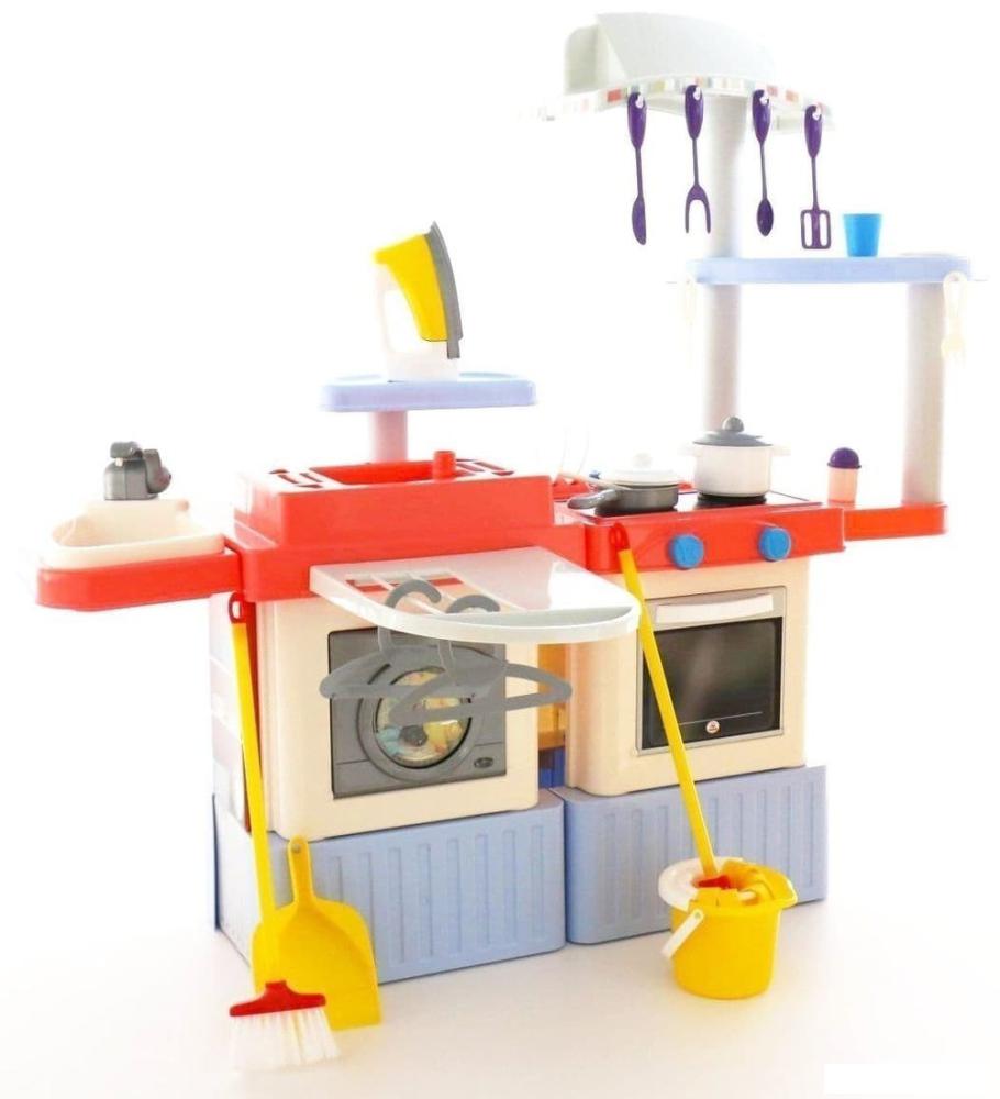 Описание Комплекс для маленькой хозяйки представлен в виде кухни, а также оборудован стиральной машиной. Набор содержит электронный кран с насосом. Налейте воду в емкость под мойкой, опустите кран и из него побежит вода. Барабан в дверце стиральной машины крутится при нажатии на кнопку включения. Чем больше будет нажатий на кнопку, тем быстрее будет крутиться барабан. | |