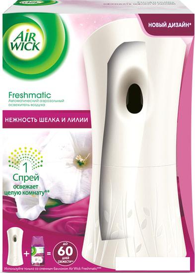 Описание Краткая информация об отличиях товара от конкурентных моделей и аналогов, сведения о позиционировании на рынке, преемственности и др. Air Wick Freshmatic, Автоматический аэрозольный освежитель воздуха в комплекте со сменным баллоном Нежность шелка и лилии, 250 мл. Просто вставьте аэрозоль в держатель, и Air Wick Freshmatic будет автоматически распылять свежий и легкий аромат в Вашем доме, радуя вас и ваших близких. |