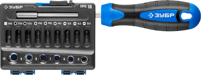 Ответка с битодержателем: 1 Биты, SLOT: SL4, SL5, SL6 Биты, Phillips: PH1, PH2, PH3 Биты, TX: T15, T20 Торцевые головки: 5, 6, 7, 8, 9, 10 Адаптер для торцевых головок: 1 |