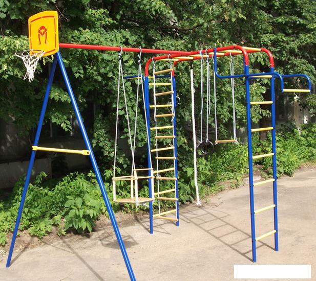 Детский спортивный комплекс для дома представляет собой шведскую стенку, которая крепится к стене или враспор между стеной и потолком, и набор дополнительного гимнастического оборудования, который устанавливается на стенку или дополнительные опоры/повесы. |