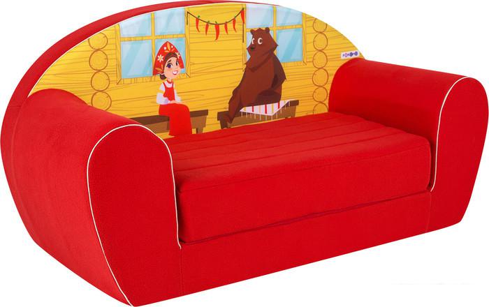 - Диван выполнен по мотивам сказки "Маша и медведь" с изображениями милых мультяшных принтов. Спинку украшают главные герои сказки. Форма диванчика максимально простая и лаконичная.
