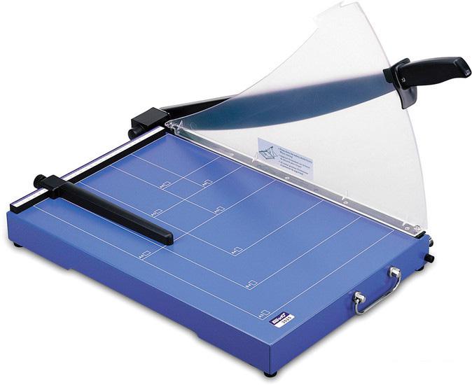 В гильотинных резаках нож подается по вертикальной оси, что позволяет с высокой точностью одновременно резать большое количество листов бумаги (до 800 листов, стопу толщиной в 80 мм). Гильотинные резаки в отличие от сабельных не деформируют бумагу, а усилие, необходимое для резки, существенно ниже. Это достигается за счет того, что рез производится перемещением рычага с гидроусилителем, и поэтому усилие по резке даже толстой пачки бумаги получается незначительным. Толщина разрезаемой стопы у гильотинных резаков несоизмеримо выше, чем у сабельных, что позволяет использовать их для интенсивной ежедневной работы в мини-типографиях. Гильотинные резаки оптимальны для использования в крупных офисах, рекламных мастерских, а более мощные модели гильотинных резаков — в типографиях и копировальных центрах. |
