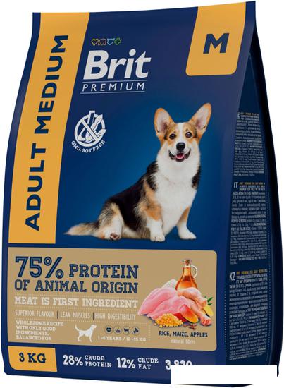 Описание Рекламное описание товара, взятое с сайта производителя, в котором кратко сообщается о предназначении и позиционировании модели на рынке. Полнорационный сухой корм Brit Premium Adult Medium с курицей для взрослых собак средних пород (10-25 кг). |