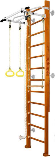 Детский спортивный комплекс для дома представляет собой шведскую стенку, которая крепится к стене или враспор между стеной и потолком, и набор дополнительного гимнастического оборудования, который устанавливается на стенку или дополнительные опоры/повесы. |