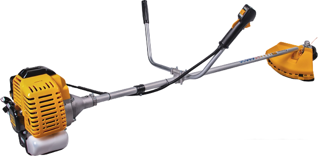 Подавляющее большинство триммеров оснащены двигателем, расположенным на конце штанги, противоположном рабочему инструменту. Во время работы двигатель поднят вверх и уравновешивает рабочий инструмент. Движение передается через редуктор и вал (обычно жесткий). |