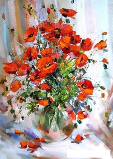 Художник Людмила Скрипченко изобразила чудесный натюрморт с маками в теплых ярких оттенках. |
