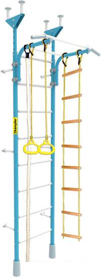 Детский спортивный комплекс для дома представляет собой шведскую стенку, которая крепится к стене или враспор между стеной и потолком, и набор дополнительного гимнастического оборудования, который устанавливается на стенку или дополнительные опоры/повесы. |