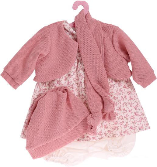розовый вязаный жакет, платье с нежным цветочным принтом, трусики, шапка и шарф |