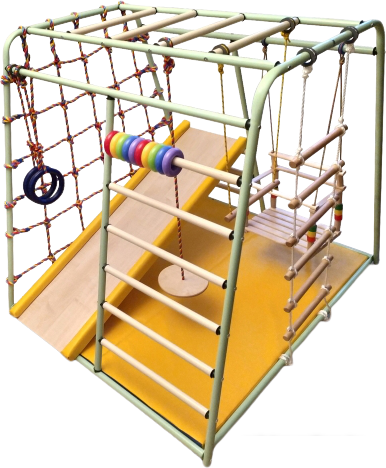Детский спортивный комплекс для дома представляет собой шведскую стенку, которая крепится к стене или враспор между стеной и потолком, и набор дополнительного гимнастического оборудования, который устанавливается на стенку или дополнительные опоры/повесы. |