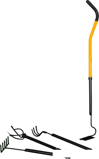- 1 эргономичная рукоятка - 4 сменных насадки: • мини-культиватор; • распашник; • 3-х зубый рыхлитель; • мини-грабли. |