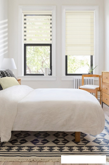 Шторы "день-ночь" состоят из двух полотен, в каждом из которых чередуются плотные цветные полосы с прозрачными, что позволяет менять степень освещения. |