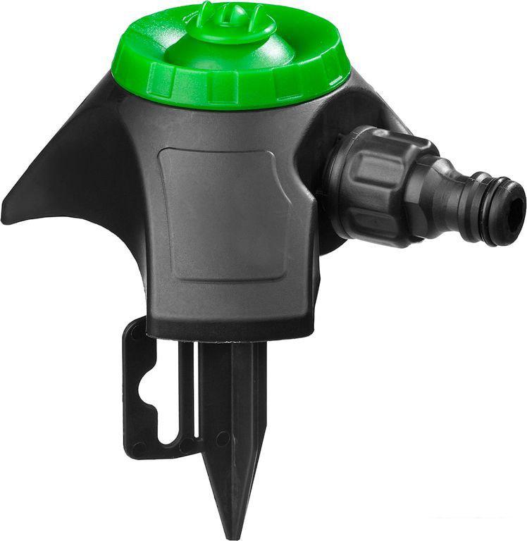 Полив по радиусу 2-3 м; Линейный полив - длина 4-6 м, ширина - 2м; Широкое основание и колышек-упор придают дополнительную устойчивость на газоне. Изготовлен из ударопрочного пластика. | |