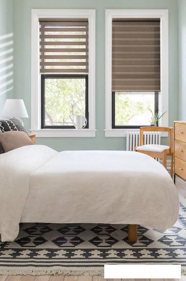 Шторы "день-ночь" состоят из двух полотен, в каждом из которых чередуются плотные цветные полосы с прозрачными, что позволяет менять степень освещения. |