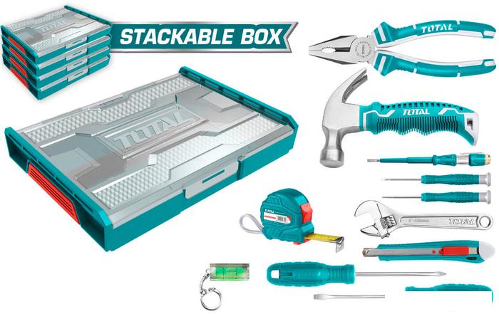 Мини-молоток - 1 шт. Комбинированные плоскогубцы 7" - 1 шт. Разводной гаечный ключ 6" - 1 шт. Индикаторная отвертка (100-500 В переменного тока) - 1 шт. Рулетка 3 м - 1 шт. Нож - 1 шт. Отвертка SL5.5x100 - 1 шт. Отвертка PH1x100 - 1 шт. Прецизионная отвертка SL2.0*50 мм - 1 шт. Прецизионная отвертка PH000*50 мм - 1 шт. Спиртовой уровень - 1 шт. Штабелируемый кейс |