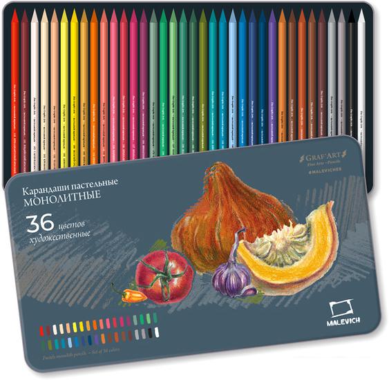 Пастельные карандаши монолиты от Малевичъ - это полнотелые карандаши без деревянного корпуса, целиком состоят из грифеля, легко точатся и их хватает надолго. Они пригодятся как любителям пастельных техник, так и профессиональным художникам-пастелистам. Тщательно подобранная цветовая палитра карандашей монолитов подходит для любых сюжетов: портрет, пейзаж, анималистка, натюрморты. В коллекции представлены оттенки от пастельных и ахроматических до ярких и сочных. Все цвета хорошо смешиваются между собой, достаточно укрывистые. В работе можно пользоваться растушёвкой, спонжами, мягкими и упругими кистями, пальцами, наносить штрихи самими монолитами. После того, как работа готова, рекомендуется закрепить рисунок лаком-фиксативом. Карандаши можно затачивать в точилке или на наждачной бумаге. Каждый из них покрыт пленкой - для того, чтобы руки оставались чистыми, а также, чтобы стержень не крошился и не подвергался механическому воздействию извне. Набор упакован в стильную жестяную коробку-пенал, который дает дополнительную защиту. На коробке есть названия цветов и выкраска. |