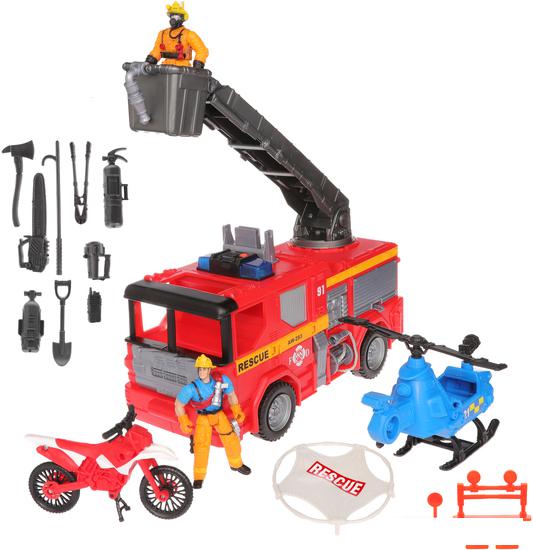 Описание Краткая информация об отличиях товара от конкурентных моделей и аналогов, сведения о позиционировании на рынке, преемственности и др. Игровой набор Спасательная пожарная машина от ЧАП МЕЙ понравится любителям героической профессии пожарного. Большая функциональная пожарная машина длиной 30 см оборудована противооткатными упорами, выдвижной вращающейся лестницей с корзиной, открывающимися большим багажником и отсеком для инструментов, оснащена проблесковыми маячками (мигалками) со звуковыми и световыми сигналами. В наборе есть и другая пожарная спецтехника - вертолёт 18 см и мотоцикл 13 см. 2 фигурки пожарных по 10 см (двигаются: голова, руки и ноги) можно усадить управлять любым транспортом, а в руку вложить инструменты, которые входят в комплект (дорожные конусы и знаки, спасительное полотно, рация, огнетушитель, лопата, фонарь, пила, кусачки, багор, топор и кислородный баллон). |