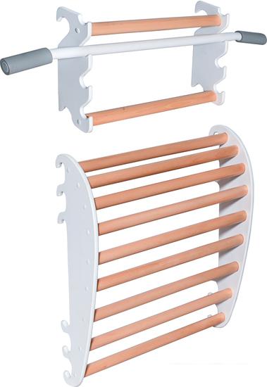 Детский спортивный комплекс для дома представляет собой шведскую стенку, которая крепится к стене или враспор между стеной и потолком, и набор дополнительного гимнастического оборудования, который устанавливается на стенку или дополнительные опоры/повесы. |