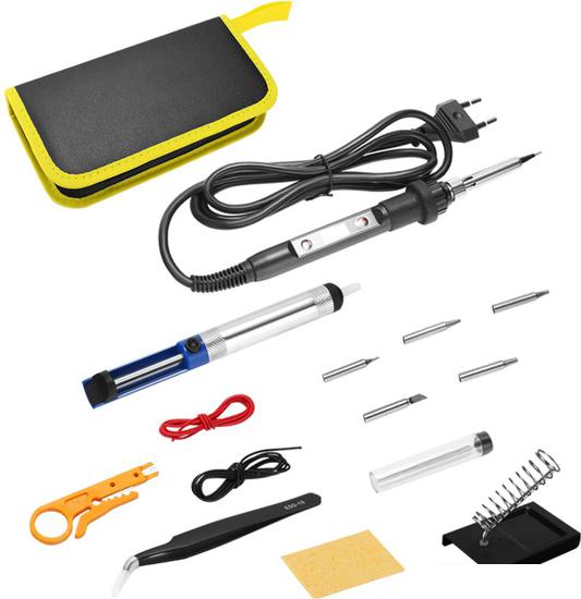 - Паяльник цифровой 80 Вт, 220 В - Комплект из 5 типов наконечников (конус, игла, клин, скос, ножевидное) - Держатель для паяльника - Губка для очистки паяльного жала - Пинцет - Оловоотсос для припоя - Нож для снятия изоляции - Припой - Провода 2 шт - Пенал на молнии |
