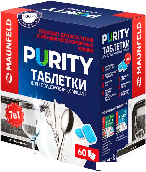 Описание Краткая информация об отличиях товара от конкурентных моделей и аналогов, сведения о позиционировании на рынке, преемственности и др. 7-в-1 таблетки MAUNFELD эффективной серии PURITY для всех типов и брендов посудомоечных машин. |