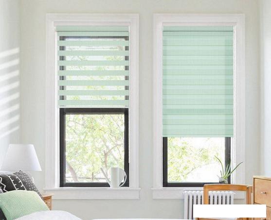 Шторы "день-ночь" состоят из двух полотен, в каждом из которых чередуются плотные цветные полосы с прозрачными, что позволяет менять степень освещения. |