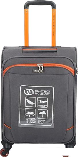 Описание Краткая информация об отличиях товара от конкурентных моделей и аналогов, сведения о позиционировании на рынке, преемственности и др. Облегченный чемодан-спиннер от торговой марки Francesco Molinary из практичного полиэстера с водоотталкивающей пропиткой серого цвета с оранжевыми деталями. Модель на четырех колесах, с выдвижной телескопической ручкой и ручкой-переноской сверху; имеется кодовый замок TSA. Отделение на молнии. Внутри: фирменная подкладка. На крышке – карман на молнии; в глубоком отделении – эластичные ремни для фиксации багажа. На лицевой стороне – карман на молнии. |