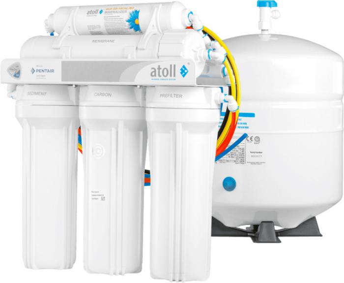 Первые три ступени очистки осуществляются префильтрами: механическая очистка воды — картриджем Pentair (Pentek) P5 из полипропилена. Задерживает примеси >5 мкм; сорбционная очистка — картриджем Pentair (Pentek) GAC-10 (гранул.уголь) удаляет из воды хлор, улучшает органолептические свойства воды; тонкая механическая очистка — картриджем Pentair (Pentek) P1 из полипропилена. Служит для удаления грязи и нерастворимых частиц >1 мкм. После предварительной фильтрации вода в atoll A-550m STD проходит следующие уровни очистки: полиамидная тонкопленочная мембрана DuPont (Filmtec) TW30-1812-50HR - очищает воду от 99,9% вредных примесей, таких как: тяжелые металлы, органические и неорганические соединения, бактерии и вирусы. Пропускает через себя только молекулы воды и кислорода; постфильтрация - минерализатором atoll GS-10CAL/RO. Он добавляет микроэлементы в очищенную воду, делает ее ещё вкуснее и нормализует значение рН. При покупке фильтра atoll A-550m STD вы получаете в комплекте накопительный бак, монтажные комплекты для врезки в водопровод и слива в дренаж, комплект соединительных трубок, систему колб и ключ для их снятия. |