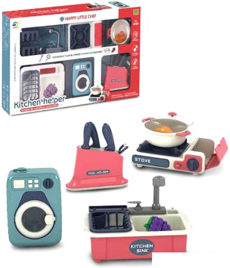 | Состав набора | раковина, сетка, краник, 2 полочки, стиральная машинка, плита, кастрюля, крышка, курица, виноград (2 детали, соединяющиеся с помощью липучки), подставка для ножей, 3 безопасных ножика, точилка для ножей, овощечистка |
