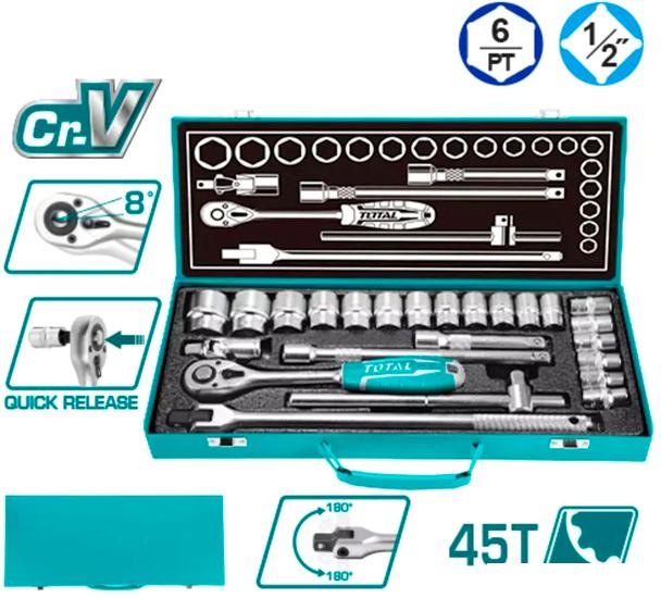 Трещотка 1/2" 45T - 1 шт. Тоцевые головоки 1/2" (10, 11, 12, 13, 14, 15, 16, 17, 18, 19, 20, 21, 22, 23, 24, 27, 30, 32 мм) - 18 шт. Универсальный шарнир 1/2 дюйма - 1 шт. Удлинитель 1/2" (125 мм) - 1 шт. Удлинитель 1/2" (250 мм) - 1 шт. Вороток T-образный с бегунком 1/2" (250 мм) - 1 шт. Рукоятка с шарниром 1/2" (375 мм) - 1 шт. Кейс |