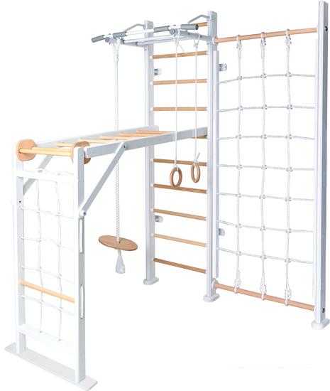Детский спортивный комплекс для дома представляет собой шведскую стенку, которая крепится к стене или враспор между стеной и потолком, и набор дополнительного гимнастического оборудования, который устанавливается на стенку или дополнительные опоры/повесы. |