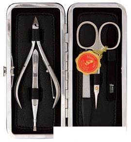 Маникюрный набор в стильном футляре из натуральной кожи на кнопках. Внутренняя отделка футляра — замша. Все предметы, входящие в комплект произведены из высококачественной инструментальной стали и заточены вручную. Цвет маникюрных инструментов — матовое серебро. |
