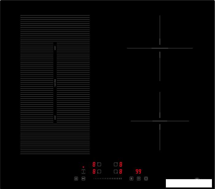 левая передняя конфорка 180мм, 1800Вт/бустер 2200Вт --- левая задняя конфорка 180мм, 1300Вт/бустер 1500 Вт --- правая задняя конфорка 180мм, 1800Вт/бустер 2200 Вт --- правая передняя конфорка 180 мм, 1300Вт/бустер 1500Вт --- флекси зона 180*380мм 3000Вт/ бустер 3600 Вт |