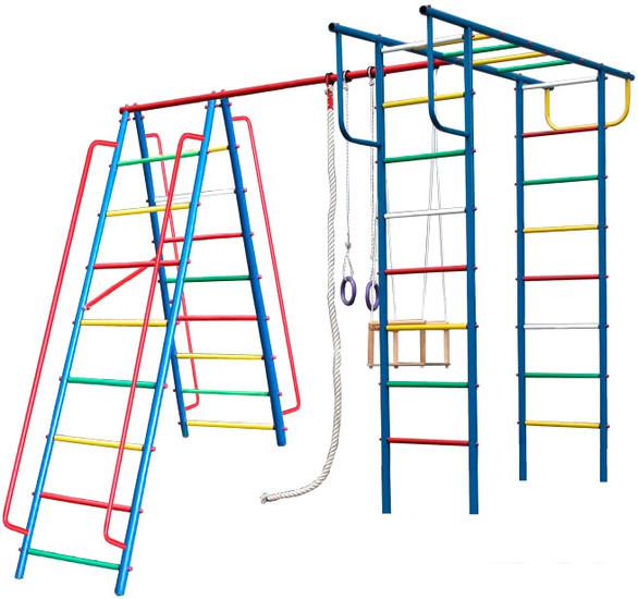 Детский спортивный комплекс для дома представляет собой шведскую стенку, которая крепится к стене или враспор между стеной и потолком, и набор дополнительного гимнастического оборудования, который устанавливается на стенку или дополнительные опоры/повесы. |