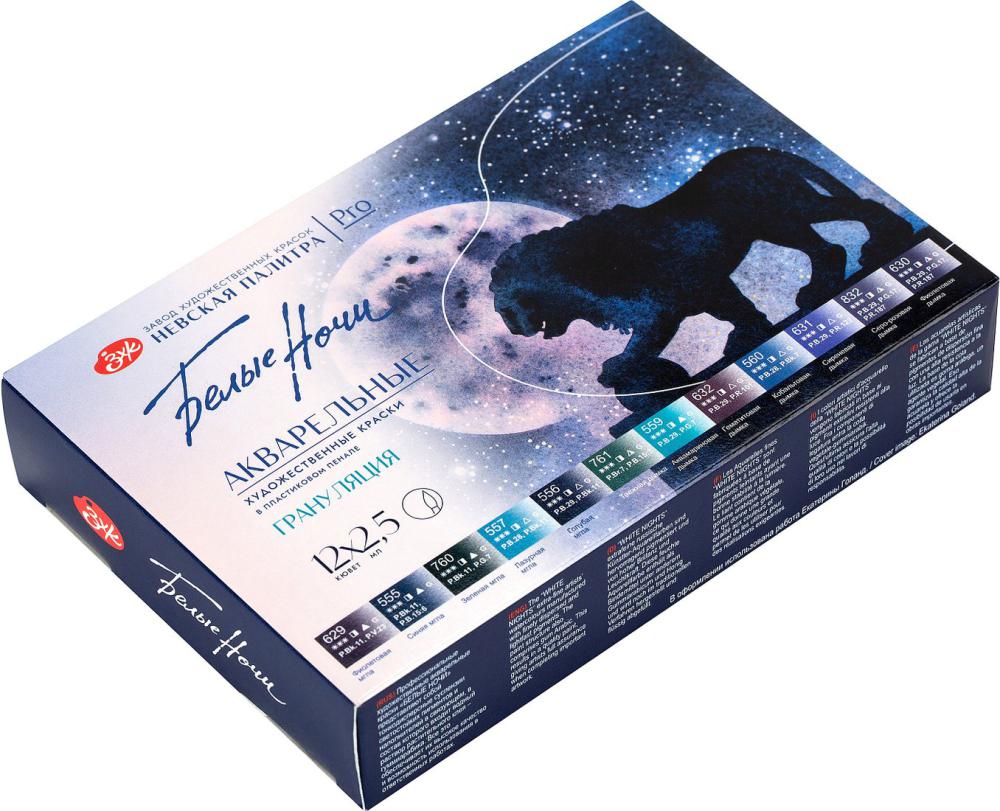 Акварель «Белые ночи» изготовлена из высококачественных тонко тертых пигментов и связующего с добавлением гуммиарабика. Цвета хорошо смешиваются между собой и легко размываются водой. Краска обладает высокой светостойкостью. Гранулирующие краски это новый взгляд на технику акварельной живописи. Благодаря крупным частицам пигментов в процессе работы краски растекаются неравномерно и распадаются на оттенки. Усиливая эффект от фактуры поверхности бумаги, позволяют создать заливки с сильной грануляцией. В зависимости от толщины красочного слоя, объёма воды и движения кисти можно получить абсолютно разные текстуры, точно передав глубину, тени, кожу, драпировки и т.д. Состав набора: фиолетовая мгла, синяя мгла, зеленая мгла, лазурная мгла, голубая мгла, таежная дымка, аквамариновая дымка, гематитовая дымка, кобальтовая дымка, сиреневая дымка, серо-розовая дымка, фиолетовая дымка. | |