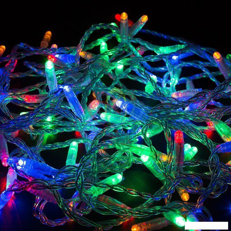 Гирлянда «Нить» представляет собой общий провод с последовательно расположенными коротенькими отводами, направленными в разные стороны. На концах этих «отростков» расположены яркие светодиоды. Общая длина гирлянды составляет 10 метров. | |