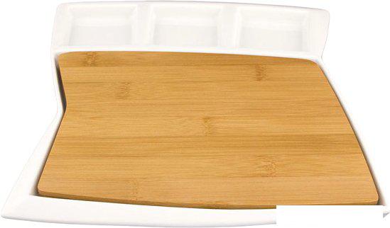 Набор сервировочный выполнен из высококачественного белого фарфора, имеет бамбуковую доску для подачи и 3 отделения для соусов, меда или других продуктов. Набор подойдет для сервировки сыра, стейков, шашлыка, рыбы, суши, роллов, конфет, пирожных, разнообразных закусок, фруктов, сладостей и другой еды. Можно использовать не только как сырный набор, но и как декоративное праздничное блюдо. Например, как пасхальное блюдо для подачи кулича. | |