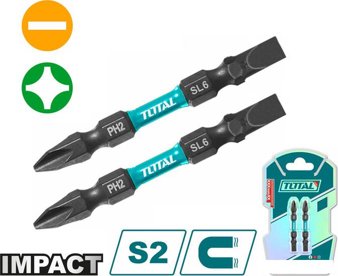 Описание Краткая информация об отличиях товара от конкурентных моделей и аналогов, сведения о позиционировании на рынке, преемственности и др. ✅ Набор бит Total TACIM72HL665 включает в себя двухсторонние ударные биты PH2 + SL6 длиной 65 мм. |