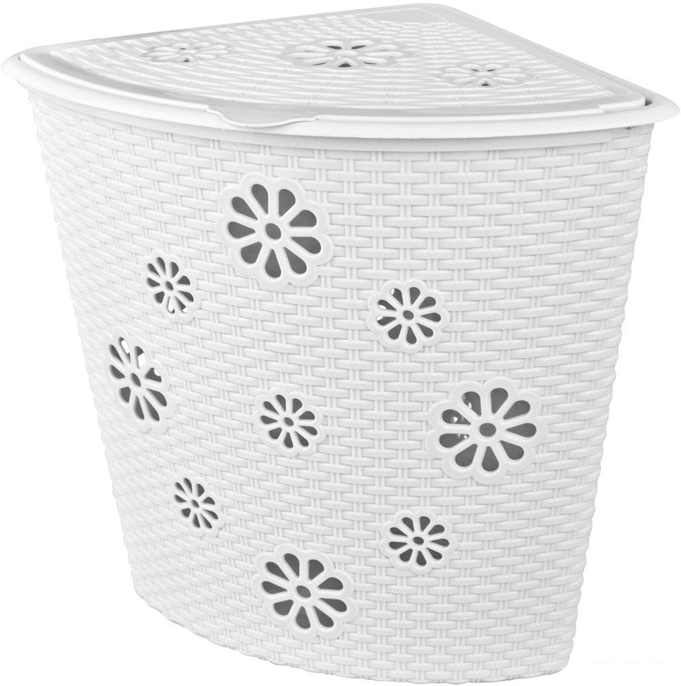 Угловая корзина изготовлена из прочного пластика и отлично подойдет для хранения белья перед стиркой. Данное изделие оснащено крышкой, что поможет скрыть содержимое корзины. Стенки корзины имитированы под плетение с небольшими отверстиями в форме цветов, которые создают идеальные условия для проветривания. Удобная и компактная корзина прекрасно впишется в интерьер любой ванной комнаты. | |