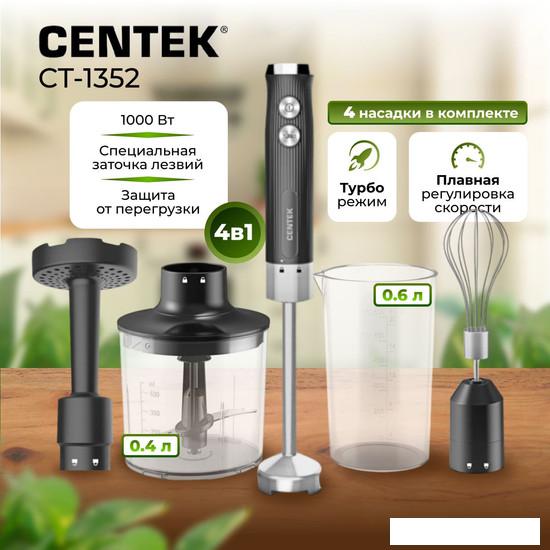 Описание Краткая информация об отличиях товара от конкурентных моделей и аналогов, сведения о позиционировании на рынке, преемственности и др. ✅ Блендерный набор 4 в 1 Centek CT-1352 - это универсальный прибор, который объединяет в себе функции миксера, ручного блендера, чоппера и насадки для пюре. |
