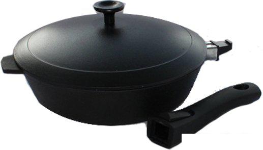 Пригодность для духовки Посуда, пригодная для духовки, имеет съемную ручку, либо ручка выполнена из металла и не подвержена порче при высокой температуре. Часто в такой посуде применяют жаропрочную эмаль вместо антипригарного покрытия. |