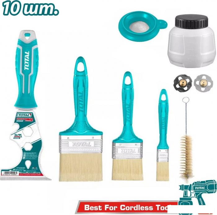 Описание Краткая информация об отличиях товара от конкурентных моделей и аналогов, сведения о позиционировании на рынке, преемственности и др. Набор принадлежностей для краскопульта и малярные инструменты TOTAL TMGF0702 |