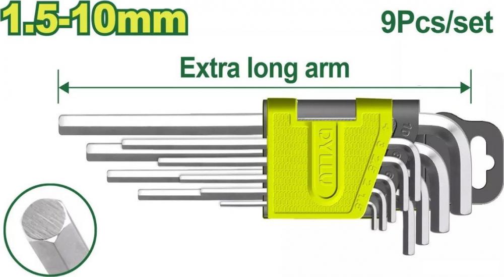 | Комплектация | набор ключей шестигранных удлиненных 1,5-10мм - 9шт.; пластиковый держатель для хранения; блистер |