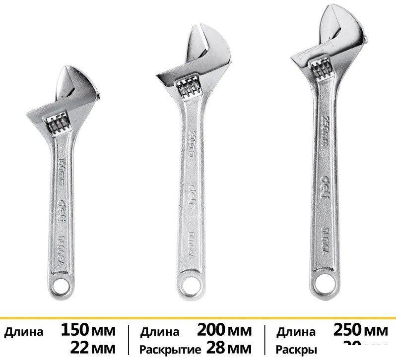 ✅ Набор разводных гаечных ключей DELI DL006A-3 включает в себя три ключа длиной 150, 200 и 250 мм, что делает его идеальным для различных задач. | |