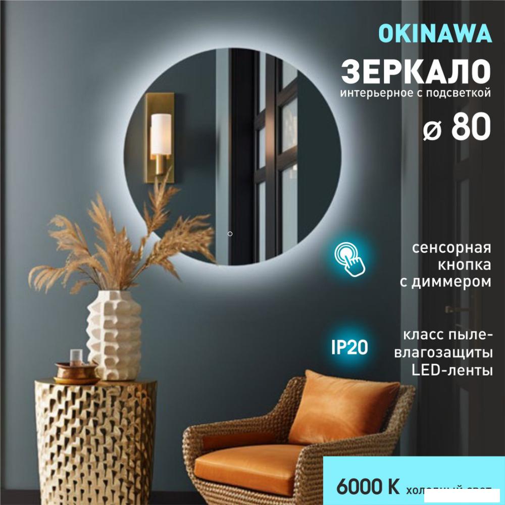 ✅ Круглое зеркало с фоновой подсветкой Okinawa 80s-6 изготовлено из зеркального полотна толщиной 4мм, уровень пылевлагозащиты IP-20. Зеркало предназначено для использования в помещениях с низкой влажностью: спальни, гостиные, коридоры и других сухих зонах. Цвет света холодный (6000 K). | |